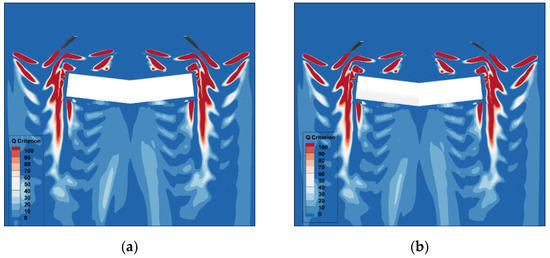 Bottom view of Q criterion contour at τ = 15°: (a) soft in-plane; (b) stiff in-plane.