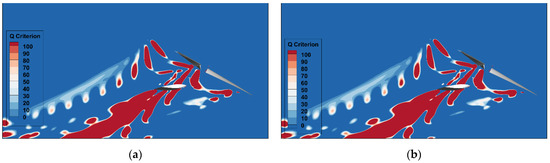 Figure 19 and Figure 20 show the slices of contour of the vorticity under the Q criterion calculated in the present work. Figure 19 is the bottom view at a tilt angle of 15°, and Figure 20 is the side view at a tilt angle of 60°. All of the slices pass through the rotor axis. The figures show that the method used in the present work can predict the structure of the vortex well, and the changes in the wake vortex after being disturbed by the wing are also clearly captured. A comparison of the vorticity contours of the soft in-plane blade and the stiff in-plane blade shows that the vortex structures of the two are basically the same, and the change in the blade structural characteristics will not affect the wake vortex structure.