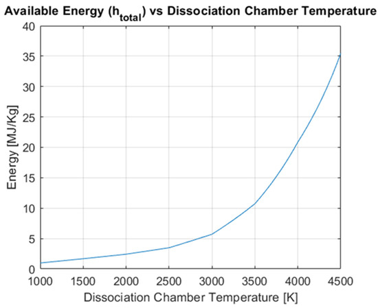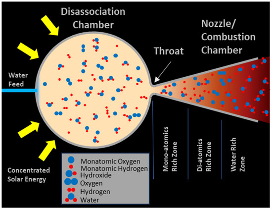 A deployable parabolic solar concentrator is envisioned [9,10], focusing solar energy onto a small spherical chamber. Liquid water is continuously injected into this spherical dissociation chamber, vaporizing and then heating it much further up to a nominal 4000 K working temperature. As shown qualitatively in Figure 2 (quantitative values are presented in Section 3.1), such high temperatures not only dissociate water molecules into molecular hydrogen and oxygen, but further dissociate much of the hydrogen and oxygen molecules into monatomic elements. Both of these steps take large amounts of energy (Figure 2 and Figure 3), and the net result is a gas mixture within the dissociation chamber which has significantly more energy than temperature alone would indicate.