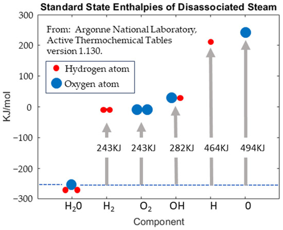 As previously shown in Figure 2, the dissociated steam components store significant amounts of energy. The standard enthalpy of formation for these dissociated components is defined as the change in enthalpy when one mole of a substance in the standard state (1 atm of pressure and 298.15 K) is formed from its pure elements under the same conditions [32]. The enthalpies used in our research are the standard state enthalpies of the dissociated components at standard conditions (temperature 298 K, pressure 1 atmosphere) found in Table 1 below for H2O, HO, H, O, H2, and O2, respectively [33].