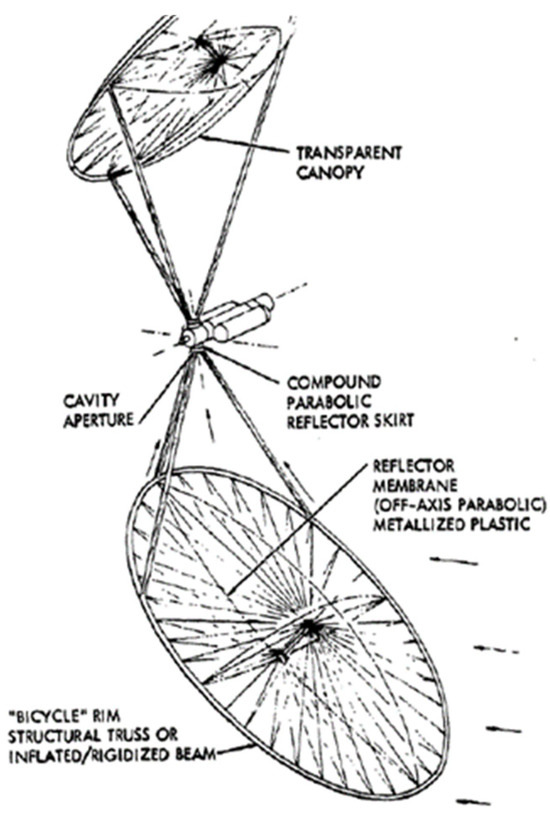 For a compact spacecraft, we propose parabolic collectors which focus the incoming solar flux onto the receiver point. Not all technologies are scalable in weight (or mass) for space applications. However, there is a way to modify the concentrator systems to make them scale well using inflatable systems [22,23]. These systems use minimal volume on launch, using compressed air for deployment once in space. Although inflatable Fresnel lenses have been used with success in space [24,25], their concentration ratio is not as attractive as membrane-type inflatable concentrators [22]. Stretched membranes for concentrating solar collectors offer the prospect of being very lightweight, structurally efficient, potentially low cost, and potentially similar in optical performance compared to the more conventional rigid glass/metal concentrator design approaches used in heliostat and parabolic dish applications (Figure 5).