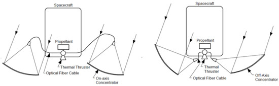 The physical design of solar concentrators to provide the necessary thermal power is another significant consideration for this concept. One idea considered was developed by AFRL (Air Force Research Laboratories) and Rockwell in 1979 involving large inflatable truss structures and reflectors (Figure 6) [26]. Another proposed system uses fiber-optics to collect the light and heat the propellant as shown in Figure 7 [27].