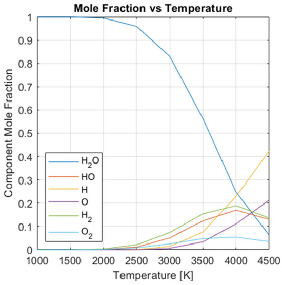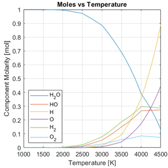 The body of research investigating the dissociation of water at very high temperatures is relatively slim. It is dominated by analytical calculations since it is difficult to reach and stabilize at our operating temperature, much less make accurate measurements there. Fortunately, classical gas dynamics are relatively well established, and a body of literature exists exploring the dissociation of water at temperatures up to 5000 K, though mostly for the exploration of industrial scale hydrogen production. Ohta et al. [12] provides a chapter in their book on water splitting systems which serves as the primary source for calculations in this paper. Chialvo & Vlcek [29] provide a model, but present only some selected parameters at temperatures no higher than 3500 K. Betelin et al. [30] propose modeling of a hydroxyl combustion process using the LOGOS code, but this would require both the code and the additional modifications for establishing the dynamics of dissociation, and this is similar to the limitations using the techniques given by L.M. Das [31], which works to model combustion dynamics. In this paper, we have utilized the molar fraction data from Ohta et al. [12] at 1 bar pressure as a baseline for our calculations.