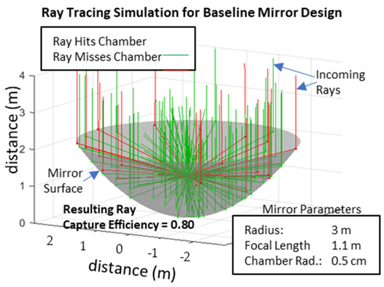 A simulation is therefore written to explore potential mirror designs for very high concentration ratios, randomly sampling incoming photons coming from the sun, and then reflecting them off a candidate mirror surface to establish whether they then strike the surface of the dissociation chamber which is located at the focal point. In general, as the distance from the mirror surface to the dissociation chamber increases, the farther the incoming ray will diverge, eventually missing the chamber completely. Figure 11 shows a mirror large enough to illustrate this effect, with rays further out from the center axis having a longer distance to travel, hence a higher probability of not hitting the chamber.