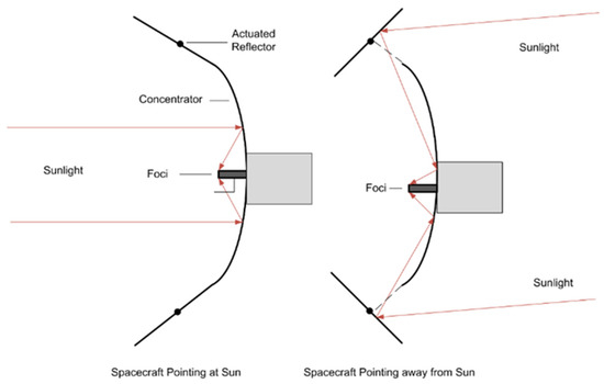 In its basic form, a parabolic concentrator is a single parabolic mirror, focusing the sun’s rays on the chosen receiver. It focusses the light by ‘reflecting’ it onto the receiver. Such a system is well established and easily analyzed. Alternatively, a Cassegrain approach (Figure 13) can be implemented, allowing the target to be moved out of the sunlight, and possibly implementing gimbaling to change thrust direction. While parabolic concentrators focus the light by ‘reflecting’ it onto the receiver. When pointing away from the sun, the configuration shown in Figure 14 could be used. The achievable concentration ratio when the spacecraft moves towards the sun, depends on the extended mirrors. While moving towards the sun the reflective mirrors focus the light by ‘reflecting’ it onto the parabolic concentrator and then reflecting on the receiver. This system is similar to a solar furnace. The additional reflection from the mirrors to the parabolic concentrator are the primary reflection losses. These losses can be minimized by using highly reflective smooth aluminum sheets which reflect more than 95% of light [34]. A smooth surface will also ensure specular reflection of light with very low diffusion. Such losses directly affect the temperature of the receiver. This will in turn reduce specific impulse and thrust generated.