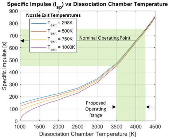 In general, a user can reduce the flow rate of the propellant to increase the dissociation chamber temperature, but this only works if there is enough power to overcome the radiant emissions of the chamber itself. For the baseline system described above, the optimal 4000 K operating temperature can be maintained up to about 2.8 AU, which means that an Isp of 643 s to 659 s can be maintained up through the middle of the asteroid belt, with modest degradation up through 3.2 AU, which is the conventional end of the main asteroid belt. Larger flow rates can always produce additional thrust, just at lower Isp values due to lower chamber temperatures. The overall effect is that of a system which shows graceful degradation from the power reduction up through the top of the asteroid belt.