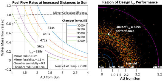 Parameters for the above-described system are sized for the solar irradiance at Earth’s orbit. The performance of a solar powered dissociative steam system necessarily declines as the distance from the sun increases. Given we wish to keep the operating temperature at 4000 K, we can decrease the mass flow rate of water as distance to the sun increases, thus maintaining specific impulse at the cost of reduced thrust, at least up to the distance where the solar concentrator can no longer maintain temperature, even for zero flow rate.