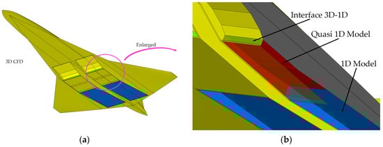 Illustration of integrated aeropropulsive multi-dimensional models: (a) simulation model of the aerodynamic components, and (b) details of the propulsion simulation models.