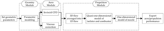 The aerodynamic and propulsive performances of the aircraft are simulated using a loosely coupled method that combines the 3D CFD method with quasi-one-dimensional models to solve the internal and external flows of the aircraft. As shown in Figure 2, a simulation model is used for the performance analysis of each component of the aircraft. The pressure distributions of the aerodynamic components and the inlet are solved using 3D Euler equations. Viscous corrections are added. The flow field in the isolator and combustor is simulated using a quasi-one-dimensional model. The pressure distribution at the nozzle surface is estimated using a one-dimensional plume method.