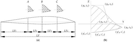 Definition of the parameters of the fuselage: (a) definition of the fuselage length and the control section station (A, B, C are the three sections of the fuselage), and (b) definition of the control points of the section.