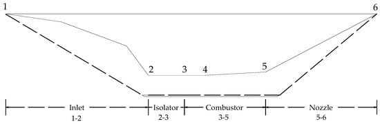 In this paper, the whole aircraft is divided into propulsive components and aerodynamic components, as shown in Figure 1, in which the red profile is the propulsive interface and the rest of the profile is the aerodynamic interface. The components in the propulsive analysis include the inlet, the isolator, the combustor, and the nozzle. The aerodynamic components are the airframe components aside from the propulsive components.