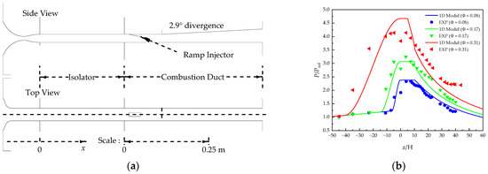 Validation of the isolator–combustor model. (a) Schematic of the DMSJ combustor with the isolator. (b) Comparison of the experimental results and quasi-one-dimensional model results. Pref = 40 kPa.