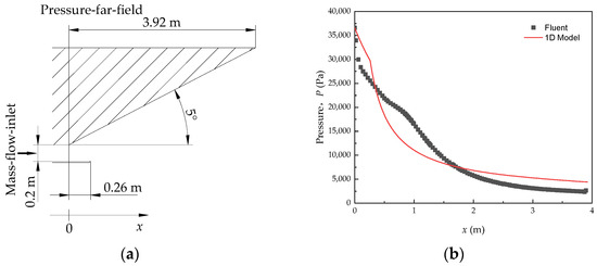 Validation of the nozzle model. (a) Configuration of the nozzle. (b) Comparison of the results from Fluent simulation and those from the one-dimensional plume model.