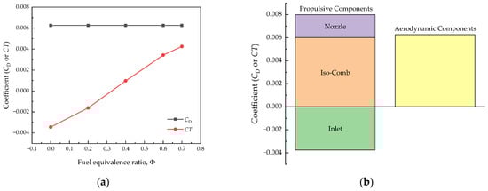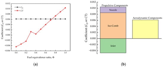 Performance of aerodynamics and propulsion. (a) Comparison of drag and net thrust coefficient. (b) Drag and thrust distribution under the conditions of Ma = 6, H = 30 km, AOA = 0°, and Φ = 0.7.