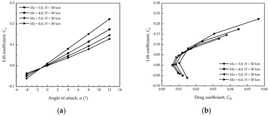 Figure 16 presents the aerodynamic performance of the revised design. As can be seen from the figure, the slope of the lift coefficient curve decreases with an increase in the Mach number. The zero-lift drag coefficient decreases with an increase in the Mach number.