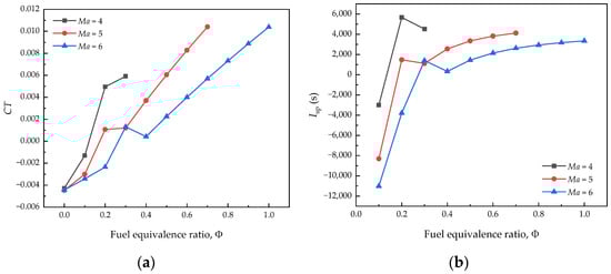 Impacts of Mach number on propulsive performance at H = 30 km and AOA = 0°: (a) variation in thrust coefficients with the fuel equivalence ratio at different Mach numbers, and (b) variation in specific impulse with the fuel equivalence ratio at different Mach numbers.