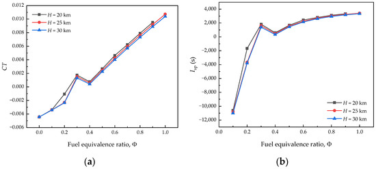 Impacts of altitude on propulsive performance at Ma = 6 and AOA = 0°: (a) variation in thrust coefficients with the fuel equivalence ratio at different altitudes, and (b) variation in specific impulse with the fuel equivalence ratio at different altitudes.