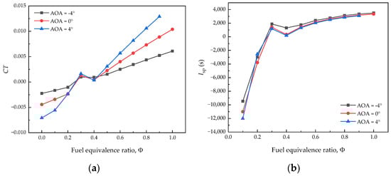 Impacts of angle of attack on propulsive performance at Ma = 6 and H = 30 km: (a) variation in thrust coefficients with the fuel equivalence ratio at different angles of attack, and (b) variation in specific impulse with the fuel equivalence ratio at different angles of attack.