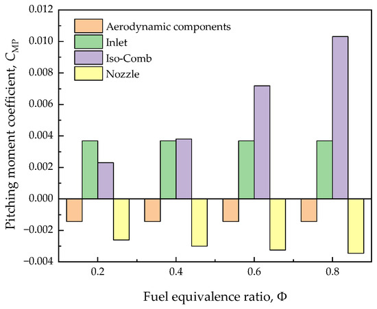 Figure 20 presents the impacts of the fuel equivalence ratio on the pitching moment under typical flight conditions. From Figure 20, the forces resulting from the aerodynamic components and nozzle provide the nose-down pitching moment, while the forces resulting from the inlet and isolator–combustor provide the nose-up pitching moment. As the fuel equivalence ratio increases, the thrusts of the isolator–combustor increase, resulting in the nose-up pitching moment. However, as the fuel equivalence ratio increases, the pressure on the nozzle increases, which leads to a larger nose-down pitching moment. As the fuel equivalence ratio increases, the pitch moments on the inlet and the aerodynamic components remain the same. The fuel equivalence ratio affects the flow in the isolator–combustor and nozzle, but the disturbance there does not affect the upstream supersonic flow. As a result, the forces acting on the inlet and aerodynamic components remain the same.