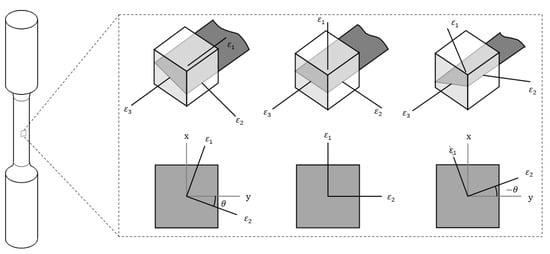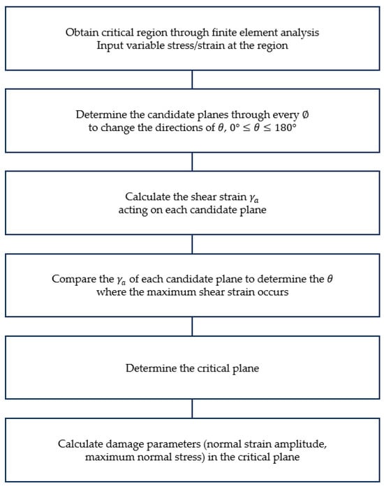 Uniaxial fatigue tests are commonly used to assess the fatigue properties of materials under a single, constant direction of loading. In actual structures, however, multiaxial stresses occur due to loads acting in various directions and the complex geometries of the structures, rather than uniaxial stress [15]. Until now, many researchers have proposed methods for assessing fatigue life under multiaxial loading [16,17,18]. Among them, Brown and Miller proposed a critical plane method to predict the fatigue life under multiaxial stresses, where the magnitude and direction of the principal stress vary over time [19]. The critical plane method is used in fatigue analysis to predict the initiation of fatigue cracks and calculate the fatigue life based on the fatigue crack growth [20]. This method assumes that fatigue cracks initiate at the critical plane, where the maximum shear stress occurs, and propagate due to the tensile stress acting on that plane, as shown in Figure 1 [21]. Figure 2 shows the procedure for determining the critical plane.