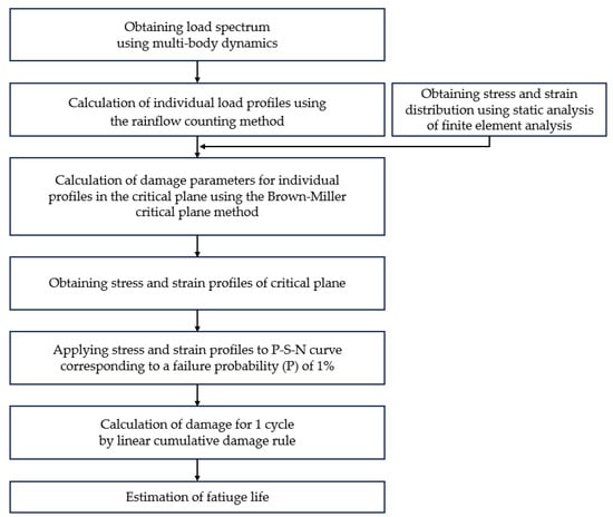 Meanwhile, the fatigue analysis model is subjected to a multiaxial stress state due to complex component shapes and boundary conditions. Therefore, the Brown–Miller and Morrow algorithms, which are multiaxial fatigue life prediction methods based on the critical plane approach, are employed to calculate the fatigue life [29]. The fatigue life for repeated loads is calculated using Equations (9)–(11) [19,30].