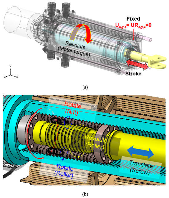 In addition, there is a permanent magnet synchronous motor (PMSM) that supplies power and a resolver that measures the speed and position of the drive shaft. Figure 8 shows the MBD model composed of joints and force boundary conditions provided by the dynamics analysis program. For external housing assembly shown in Figure 8a, the connectors (four EA), housings (front, mid, and rear), and rod were merged into a single entity, and the front part of the housing was constrained with 6 degrees of freedom based on the mounting conditions. Figure 8b shows the calculation model of roller screw assembly. The linear motion of the screw was simulated with a translational joint, and the bolt-fastened mount and nut were merged under the merge condition shown in Figure 8b.