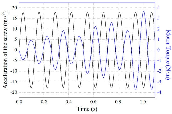 The acceleration history was applied to the screw to simulate the screw’s stroke, and the motor’s torque over time was replaced with the rotational axial force shown in Figure 9. Meanwhile, Figure 10 shows the roller screw kinematic relation diagram.