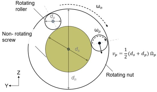 where and represent the scale factor and velocity of the base element, while c2 and v2 are the scale factor and velocity of the action element. Here, the scale factor of the action element (c2) is assumed to be 1, relative to the base element’s scale factor () and is calculated based on the relative velocity between the base and action elements. The motion velocities of the nut, rollers, and screw were calculated using Equations (5)–(8) [25].