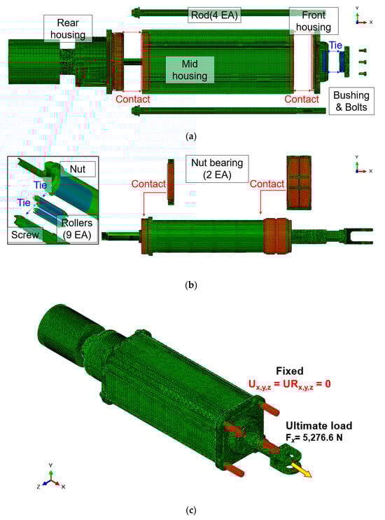 Therefore, in this study, static analysis of the obtained UL conditions from the MBD analysis was conducted. To perform a detailed analysis of the power transmission screw of the EMA, the entire EMA model (model#1) and a reduced model of the roller screw thread (model#2) were distinguished. Figure 11 shows the finite element model and boundary conditions for model#1. For the housing assembly shown in Figure 11a, surface-to-surface conditions were applied to the junctions of the external housing (front, mid, and rear) and the rods, and the ABAQUS Bolt pretension condition was used for the rod axis to fasten the housing. The pretension load for the collar bolt was based on the design bolt load for M 5 specified in the KS B 0233 (ISO 898-1) standard, and a standard bolt tension of 8.12 kN was applied, considering a 10% additional increase for loosening [28].