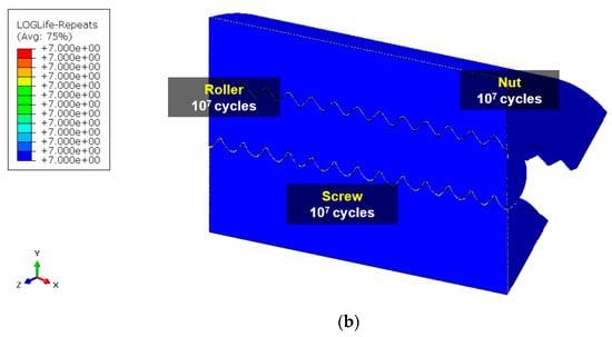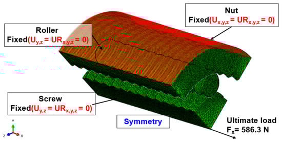 Figure 12 shows the finite element model of model#2. The elements of the reduced model of the roller screw thread were composed of C3D8R, and the area of the screw thread where high equivalent stress was predicted was modeled more densely. Surface-to-surface contact was applied to the threaded contact surfaces of each component, and the outer surface of the nut was fixed with 6 degrees of freedom. Additionally, all degrees of freedom except for movement along the X-axis of the roller and screw were constrained, and a load was applied to the axis of the screw. Assuming that the load is evenly distributed among the rollers (nine EA), the axial load of 586.3 N shown in Figure 12 is calculated by dividing the UL (5276.6 N) by the number of rollers (nine EA). The materials and the number of elements and nodes used in the structural analysis are listed in Table 4.