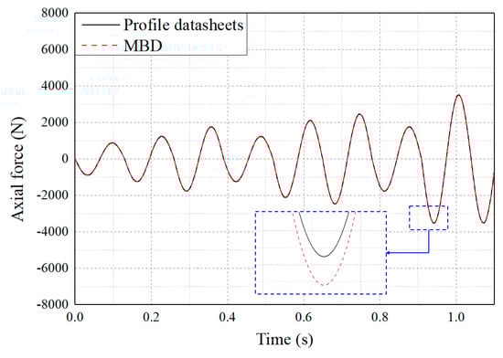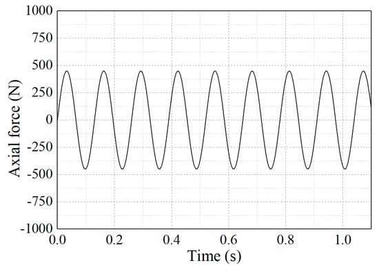 In Figure 13, the axial force is applied at the same point where the UL is applied in Figure 12. Additionally, the amplitude shown in Figure 13 is calculated by dividing the drive load of the maximum load (3517.7 N) by the number of rollers (nine EA) and multiplying the result by 1.15.