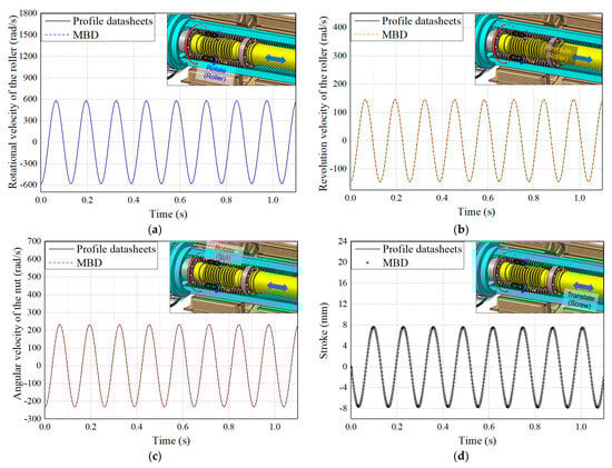 Results of multibody dynamics analysis: (a) rotational angular velocity of the roller; (b) revolution angular velocity of the roller; (c) angular velocity of the nut; (d) stroke of the screw.