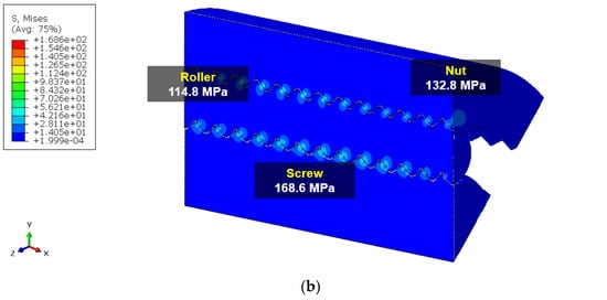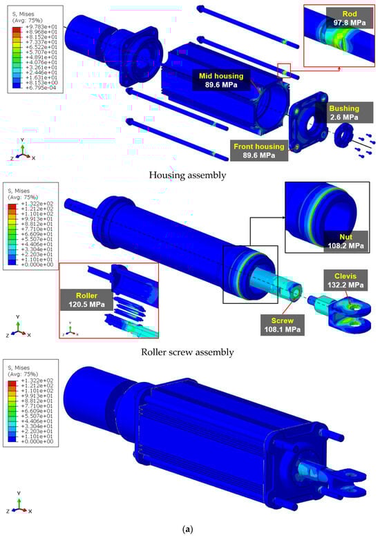 where and represent the yield strength of the material and the von Mises stress under the UL condition. If the value of the MS is smaller than zero (MS < 0), the design needs to be improved because structural design requirements are not satisfied. Figure 16a shows the von Mises stress distribution of model#1calculated through the static analysis. The calculated maximum von Mises stress of the model#1 (132.2 MPa) occurred at the clevis. Because stress concentration occurred due to the abrupt change in shape and it was at 34% of the yield strength of the applied material (aluminum), therefore resulting in an MS value of 1.9. Furthermore, for the rod and front housing, the maximum von Mises stress values under the UL condition were found to be 97.8 (25%) and 89.6 (56%) MPa, respectively, and the maximum stress occurred in the area where the rod and front housing were in contact with each other. The corresponding MS values were calculated to be 2.9 and 3.3, respectively. Additionally, Figure 16b shows the static analysis results of model #2. the maximum von Mises stress values for the nut, roller, and screw were calculated as 132.8, 114.8, and 168.6 MPa in the regions where each thread contact occurs, as shown in Figure 16b. Additionally, the MS values were found to be 11.8, 13.8, and 9.1. For other components, equivalent stresses were found to be below 30 MPa, confirming structural safety.