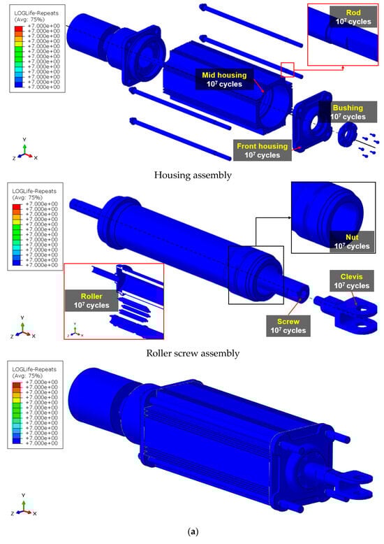 In this study, a fatigue life of 107 cycles or more, specified as the requirements, was considered as infinite life. For a conservative analysis, a load history of the actuator completing 7.5 reciprocating cycles was defined as 1 cycle. Nonetheless, in the case of the model#1, the fatigue life of all key components was calculated as 107 cycles as shown in Figure 17a, confirming structural safety compared to the typically required fatigue life for aircraft components (106 cycles) [32,33,34,35]. Figure 17b shows the fatigue analysis results for model#2. Specifically, the clevis which showed higher von Mises stress compared to other components in the static analysis, and the conservatively analyzed model#2, both calculated a fatigue life of over 107 cycles, affirming structural integrity under fatigue loads. Therefore, the MS and fatigue life resulting from the structural analysis of the EMA are listed in Table 5. As presented in Table 5, an MS of 1.9 or higher was calculated, Additionally, a fatigue life of 107 cycles was determined. Accordingly, all key components of the EMA were found to be structurally safe against ULs and repeated loads (MoS ≥ 0).