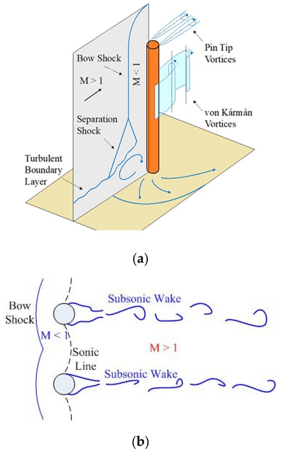 Rather than a single cylinder, the current study is focused on a spanwise cylindrical pin array installed on a wall over a supersonic turbulent boundary layer. When multiple cylinders are placed in an array across the flow, the front bow shocks merge [10,11]. Flow immediately behind the combined bow shocks is subsonic, and a curved sonic line exists between the cylinders, past which the flow is again supersonic [12]. The subsonic wake and pin tip vortices continue propagating downstream and may interact with flow structures formed by adjacent pins. The resulting flow field is illustrated schematically in Figure 1b. Even though several relevant numerical works have been published, the three-dimensional detailed flow structure behind a pin array with free ends is largely under-investigated. A similar situation is the flow oscillation frequency induced by a pin–flow interaction. The vortex shedding oscillations behind an obstacle in incompressible flow are well studied [13,14], concluding that over a wide range of Reynolds numbers, Red = 3⋅102–105 and the frequency of oscillation corresponds to Std = 0.18–0.22, where d is a characteristic dimension of the obstacle. For compressible supersonic flows, the published data [15,16], although rather limited, indicate the governing Strouhal number is about two times larger, Std = 0.4–0.45. These data are related to a long cylinder installed cross-flow. In the case of the current study, the limited-height cylindrical pins are installed on the wall and partially located within the BL, which makes the published data marginally applicable. The major objective of this work is to contribute to a basic understanding of the processes involved during pin array interactions with supersonic flow.