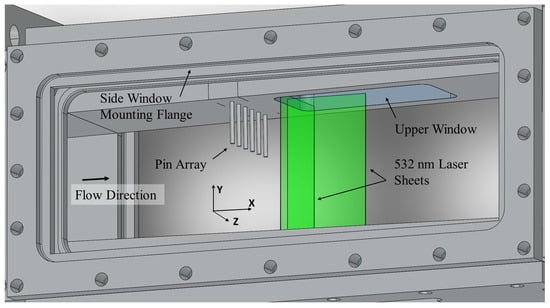 The interchangeable pin array inserts are composed of seven stainless steel cylindrical pins press-fit into threaded aluminum inserts, one of which is installed on the upper wall of the test section. The pin array inserts have a pin diameter d = 2.5 mm, pin spacing l = 10 mm center-to-center, and three different pin heights, h = 25 mm, 10 mm, and 5 mm. The thickness of the incoming turbulent boundary layer was estimated to be δ = 4 ± 0.5 mm. In addition to quartz panoramic side walls, rectangular fused silica windows 2 inches in the spanwise direction and 4 inches in the streamwise direction are flush-mounted on both the upper and lower test section walls downstream of the pin array inserts to provide optical access to the wake region. An illustration of the test section is shown in Figure 2. For the PLIF and Mie scattering visualization, the laser sheet was arranged in two ways: in a flow-wise direction (XY plane) and a cross-flow direction (YZ plane). The laser sheet positions are variable on the X and Z axes, correspondingly.