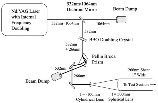 Laser excitation is performed using the 4th harmonic of an Nd:YAG laser (Quanta-Ray DCR-4) with a 10 ns pulse width and 10 Hz repetition rate. After frequency doubling from 1064 nm to 532 nm and again from 532 nm to 266 nm, the pulse energy is approximately 70 mJ/pulse. Sheet-forming optics are then used to produce a 25 mm wide 266 nm laser sheet that is approximately 200 μm thick at the sheet waist within the test section. The laser sheet forming arrangement is illustrated in Figure 3.