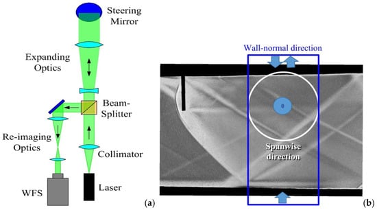 (a) Schematic of the optical set-up using a Shack–Hartmann wavefront sensor (WFS) and (b) laser beam λ = 532 nm arrangements in the wall-normal (blue box) and in the spanwise (white circle) directions.