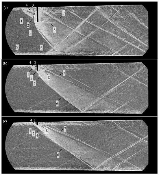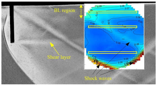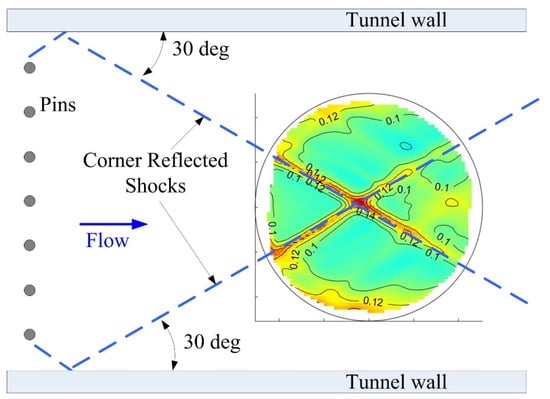 A weak shock wave enters the flow field in the bottom left corner of Figure 6b, which is created by a small step on the bottom wall. Since this step is 25–50 μm high, this weak shock may be considered a Mach wave with infinitesimal strength. The wave angle of this Mach wave downstream of the oblique shock formed by the bow shock around the pin array and the expansion fan emanating from the pin tips is about with respect to the horizontal. Since the flow is reaccelerated by the expansion fan emanating from the pin tips immediately downstream of the oblique shock, the streamline direction downstream of the expansion fan is approximately horizontal. Using the relation it is found that the Mach number is about , indicating that after the expansion fan emanated from the pin tips, the flow behind the straight oblique shock returned to approximately the same Mach number as the flow in the undisturbed upstream region. However, due to the greater shock strength in the curved bow shock region near the pin array, the Mach number in this region is .