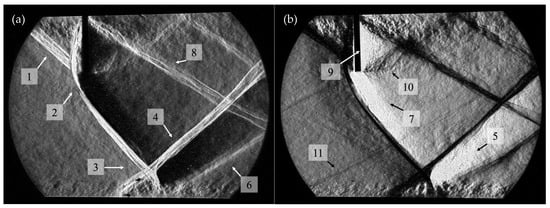 Detailed views of the 25 mm pin array are given in the schlieren images of Figure 6, which uses vertical knife edge arrangements. Visible in these images are the lambda shock structure upstream of the pin array (1); a bow shock (2), which curves around the pin tips; oblique shock impingement on the boundary layer of the bottom wall with boundary layer separation (3); reflected oblique shock (4), expansion fan (5), and reattachment shock (6); and an expansion fan at the pin tips (7), an oblique shock originating near the pin base due to boundary layer reattachment (8), flow acceleration through the pin array (9), and an oblique shock crossing the supersonic region downstream of the pin array (10). Weak Mach waves (11) are present upstream of the bow shock originating from small imperfections on the walls.