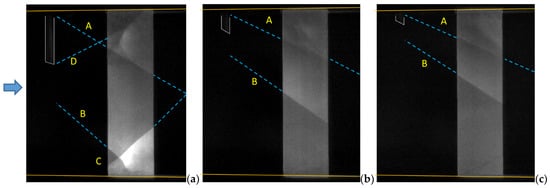 An oblique shock “A” originating near the pin base due to boundary layer reattachment is visible in the upper portion of Figure 7a. The strong oblique shock “B” from the pin array impinges the BL near the bottom wall in Figure 7a, providing a SWBLI pattern with a separation bubble, and reflected oblique shock “C” is especially evident. Since the acetone fluorescence intensity is a linear function primarily of flow density, brighter regions in the PLIF images downstream of the shock waves indicate regions in the flow with higher density. The density of the flow region in Figure 7a is greatest immediately downstream of the reflected oblique shock. The shock-induced separated area near the wall is also visible in Figure 7a. The corner shock “A” and oblique shock “B” are visible in Figure 5b and Figure 7a,c, but progressively less so due to the weakening of the shocks with the decreased height of the pins.