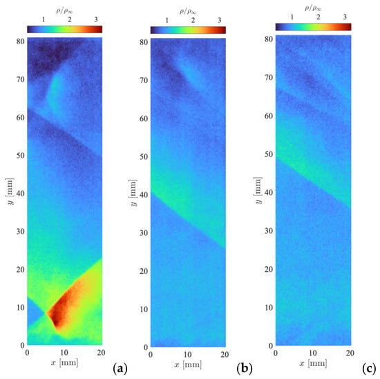 The quantitative density fields presented in Figure 8 are recalculated from the PLIF images by linearly extrapolating the intensity of the laser sheet image after subtracting the off-plane background to account for the sensor dark current and background scattering, and scaling by the average pixel value in the freestream region. The density of the freestream kg/ is obtained from isentropic relations with a nominal freestream Mach number of .