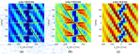 For the data set along the spanwise direction, dispersion analysis was also used to estimate the convective velocities at different distances from the wall. In [30,34], the dispersion analysis of the deflection angles was demonstrated to be effective in characterizing convecting optical disturbances. The dispersion analysis uses time-resolved streamwise deflection angles in several consecutive streamwise points, to numerically compute a two-dimensional autospectral density function of the deflection angles, , using the standard procedure [35]. A stacking approach [30] was used to de-alias the spectra in the frequency domain. If the flow structures convect with a constant speed, the spectrum will have a single branch with a fixed slope. The convecting velocity, , both the direction and magnitude, can be computed from the branch slope as .