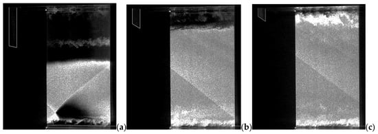 The Mie scattering images in Figure 12 were taken using a 50 mm wide 532 nm laser sheet positioned on the centerline of the test section and against the upstream edge of the fused silica window. Similar to Figure 6, oblique and reflected shocks and a turbulent boundary layer are visible in Figure 12, as well as weak corner shocks in Figure 12b,c.
