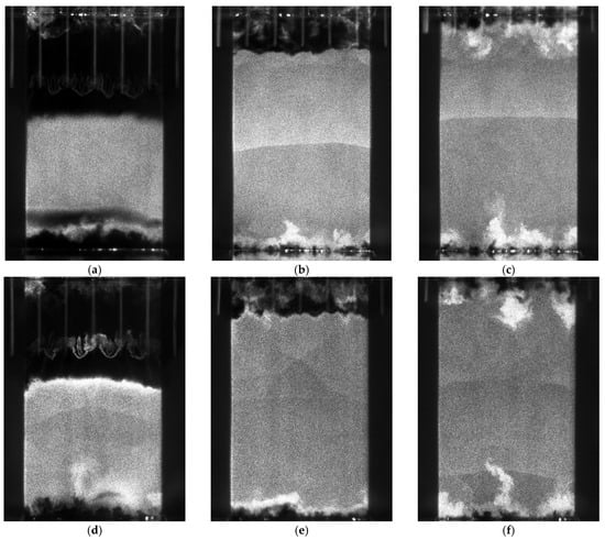 The droplet-free region behind the oblique shock impingement in Figure 12a is visible as a dark strip near the bottom of Figure 14a. The large-scale structure is visible in the interface between the warmer droplet-free region behind the pins and the cooler droplet-filled region in Figure 14, and the size of the structures is similar to the pin-to-pin spacing. These structures grow in size as the flow moves downstream and the two regions mix together.