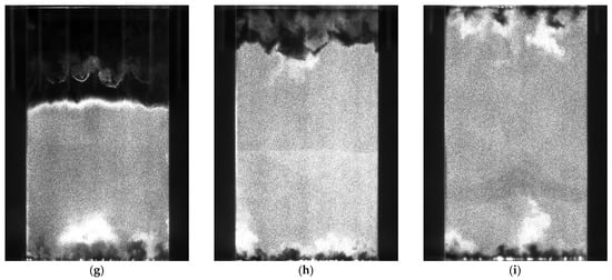 Mie scattering cross-flow single shot images. (a) 25 mm from 25 mm pins; (b) 25 mm from 10 mm pins; (c) 25 mm from 5 mm pins; (d) 50 mm from 25 mm pins; (e) 50 mm from 10 mm pins; (f) 50 mm from 50 mm pins; (g) 75 mm from 25 mm pins; (h) 75 mm from 10 mm pins; (i) 75 mm from 5 mm pins.