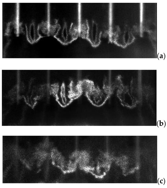 The shear layer boundary at the end of the 10 mm pins is visualized using Mie scattering in Figure 16b, and a regular pattern is observed in which the boundary is higher directly beneath the pins than between the pins. This is thought to be related to structure (2) in Figure 16a and due to flow expansion through the 2D nozzle created by adjacent pins.
