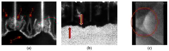 Several flow field areas are indicated in Figure 16, which are of particular interest for this work, including the fine-scaled structures near the end of the pin tips shown in Figure 15 and Figure 16a. To the best knowledge of the authors, experimental visualization of such structures is not discussed in the available literature.