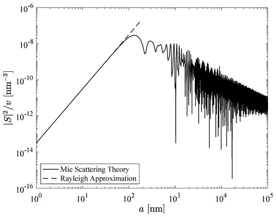 As shown in Figure 18, the magnitude of the scattering amplitude function squared at scaled by the droplet volume has a maximum at a radius of about nm for nm light. Thus, while scattering from a spherical droplet increases with increasing droplet radius, the scattered light intensity per unit volume of droplets has a maximum at a droplet radius of approximately . This results in increased light scattering in regions with numerous small droplets. The linear region at small in Figure 18 corresponds to the Rayleigh scattering regime.