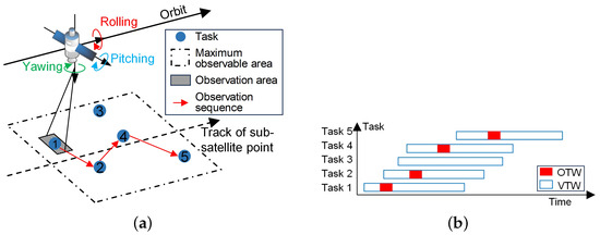 Agile optical satellites (AOS), as a new generation of Earth-observation platforms, have flexible attitude maneuverability and advanced imaging capabilities, which can adjust attitudes by rolling, pitching, and yawing. Over past years, AOSs have played an increasingly significant role in agricultural production [1], resource exploration [2], military reconnaissance [3], and other fields. In the current Earth-observation satellite-management system, the ground operation center collects observation requests from users daily and then generates task schedules in a centralized processing way [4]. A task schedule consists of a task allocation plan and observation instructions for satellites, and the observation instructions are uploaded to the corresponding satellites through ground stations. In the operation center, an effective and efficient scheduling algorithm is crucial for improving the scheduling effect of the whole system.